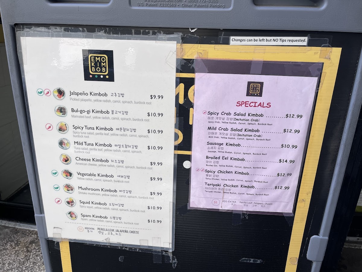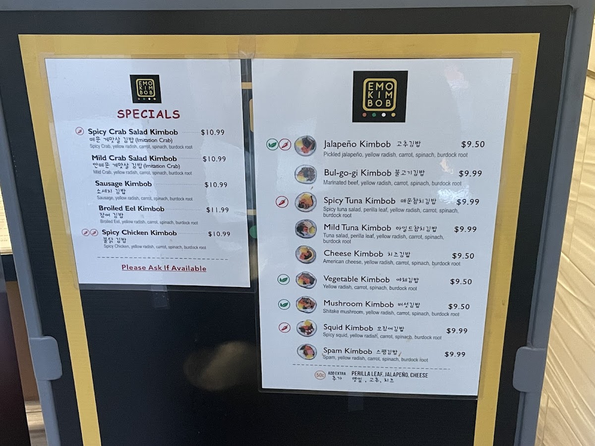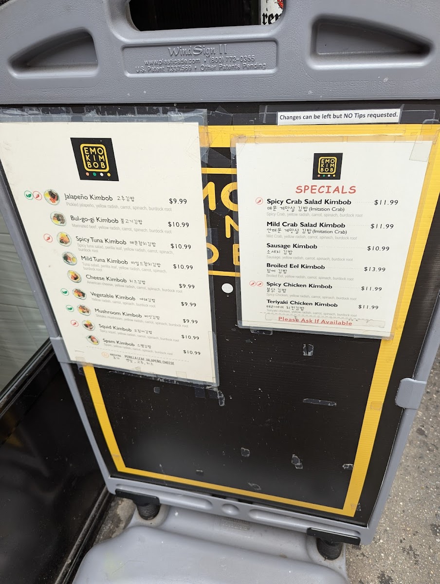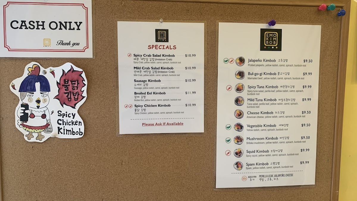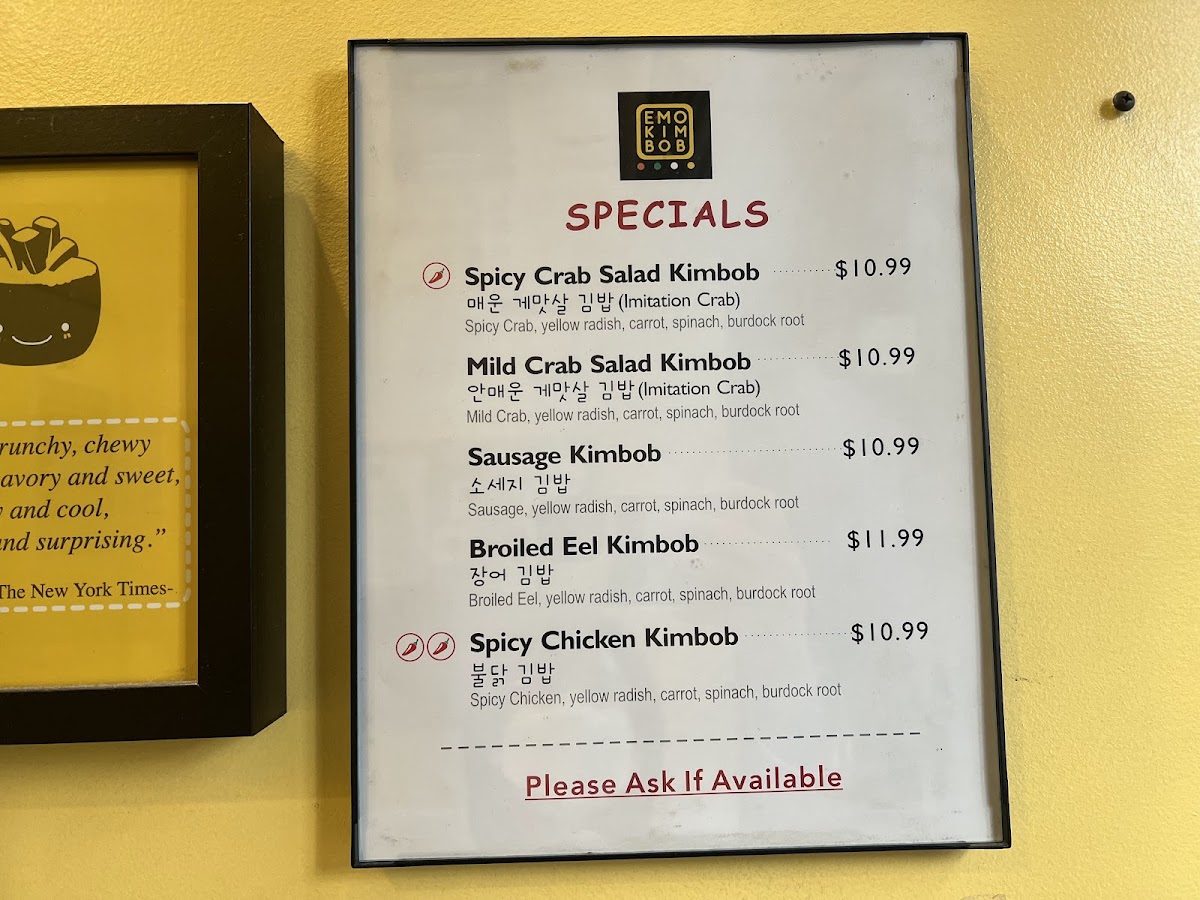 In addition to the main offerings, the restaurant provides Special Menu items, which are available based on the restaurant’s daily selection. These specials include the Spicy Chicken Kimbob, which promises a fiery kick, the Mild Crab Salad Kimbob for those seeking something lighter, and the Spicy Crab Salad Kimbob for a more intense seafood experience. For those looking for something a bit different, the Sausage Kimbob and Broiled Eel Kimbob offer an interesting fusion of flavors. The availability of these specials depends on the day, so guests are encouraged to check for these delicious surprises.