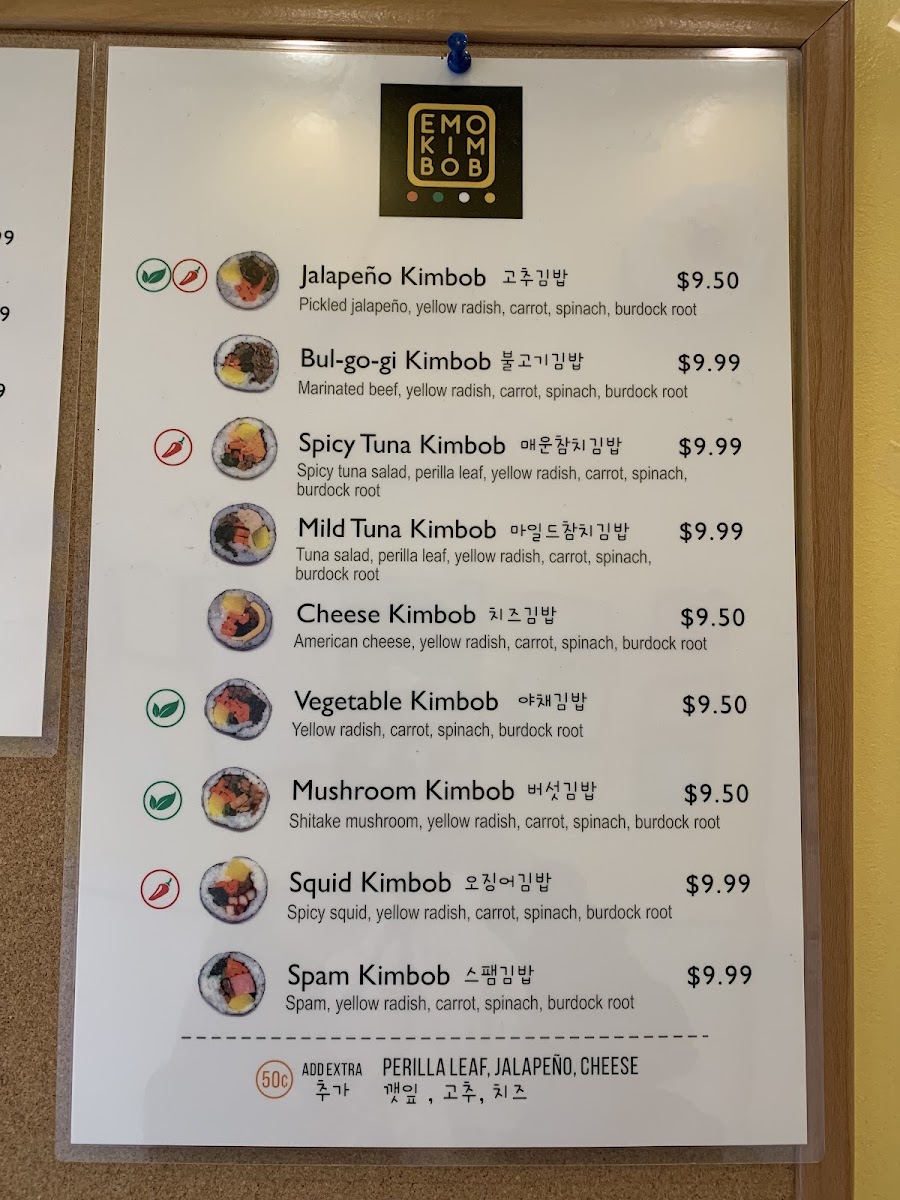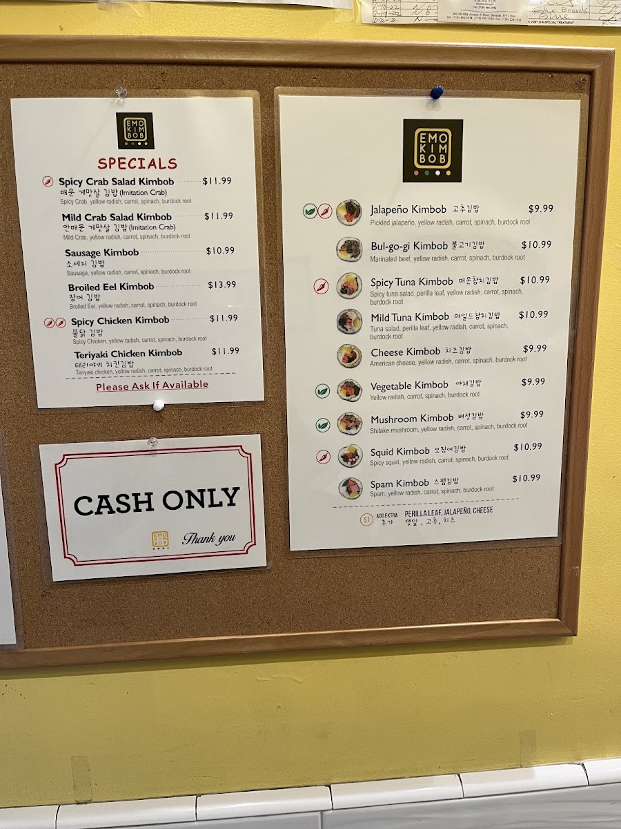 E-Mo New York, located at 2 W 32nd St, New York, offers a unique and flavorful dining experience through its carefully curated menu. Their Main Menu boasts a variety of Kim Bobs that blend the essence of Korean flavors with the convenience of sushi rolls. The standout options include Jalapeno Kimbob, known for its zesty kick, Bul-Go-Gi Kimbob, which features tender marinated beef, and the Spicy Tuna Kimbob, which packs a delightful punch with fresh tuna. For those preferring milder options, the Mild Tuna Kimbob offers a more subtle taste, while the Cheese Kimbob is perfect for cheese lovers looking to indulge in creamy goodness. These dishes are designed to cater to a variety of tastes, from bold to more delicate flavors.